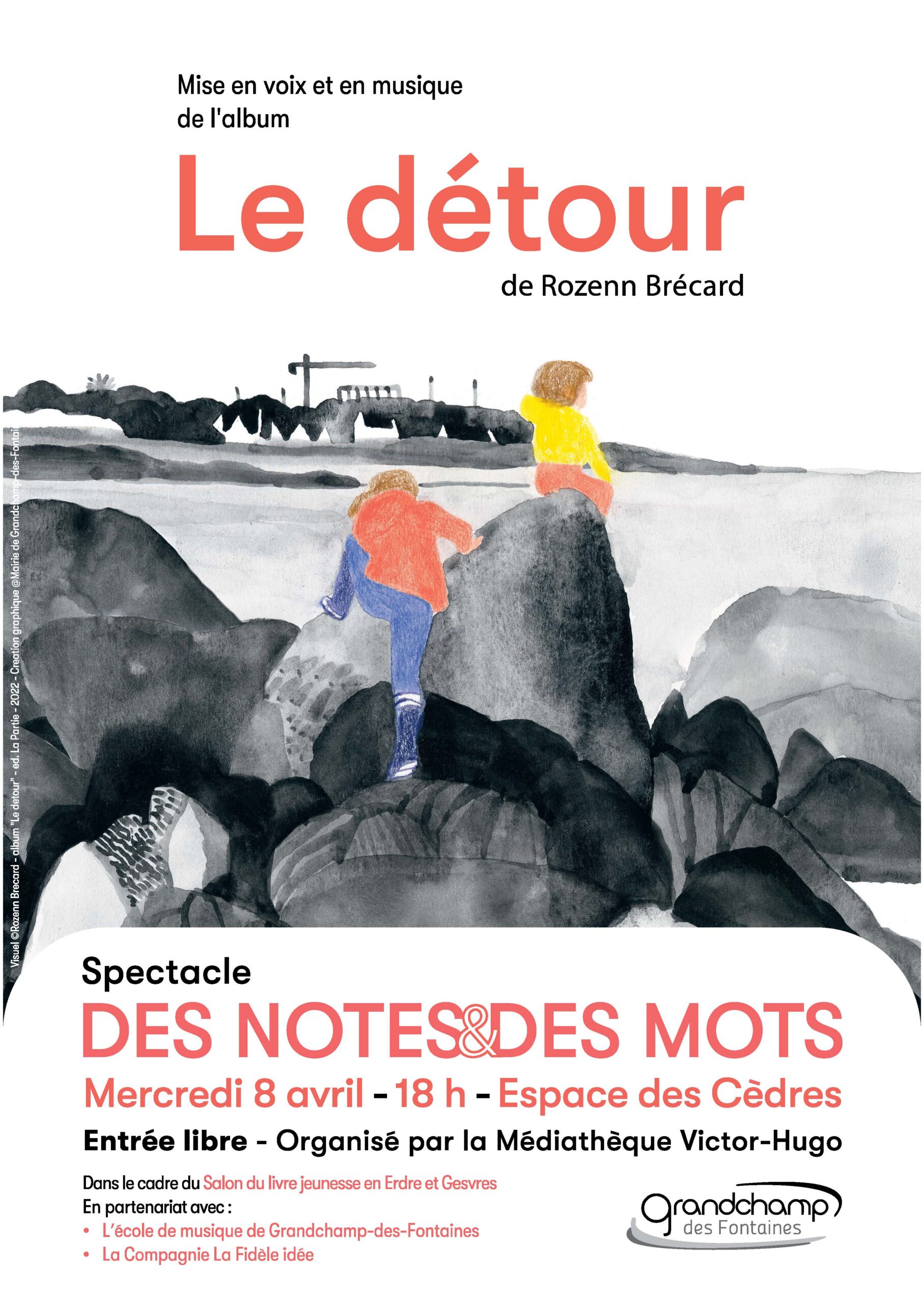 Dans le cadre du salon du livre jeunesse en Erdre et Gesvres, l’école de musique s’associe à la médiathèque pour vous présenter un spectacle tout en voix et musique en lien avec l’album : Le Détour de Rozenn Brécard.